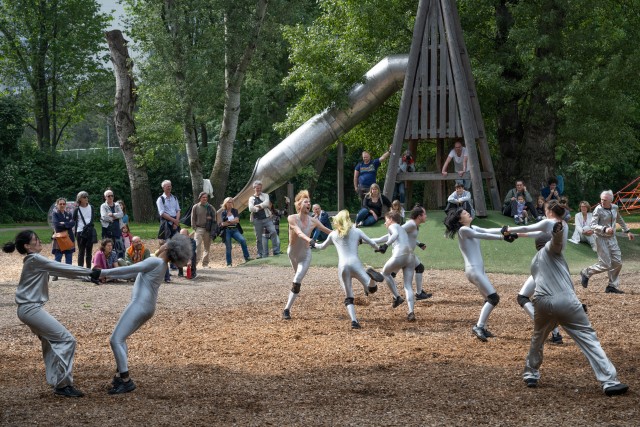 Ein Schiff, ein Schloss, ein Auto und ein Pferd. Als Kinder finden wir auf dem Spielplatz eine kleine Welt vor. Gebaut zum bloßen Vergnügen, für körperliche Ertüchtigung und als Bühnenbild für blühende Fantasien, treten die Spielplatz-Bauten in 'melancholic ground' jenseits ihrer gewohnten Funktionen auf. Die Performer*innen verschiedener Generationen vollziehen ihre Bewegungen in extremer Langsamkeit, in stockendem Fluss oder bieten sich, plüschkostümiert und mit Körpererweiterungen, selbst zum Spielzeug für die anderen an. Dabei geht Doris Uhlich dem Gefühl der Melancholie nach. Anstatt zur Vereinzelung zu führen, macht 'melancholic ground' den Zustand kollektiv erlebbar. Im absurden Disneyland zwischen Klettergerüst und Sand wird subtiler Widerstand geleistet, gegen das Diktat der Produktivität und die Normierung der Körper.